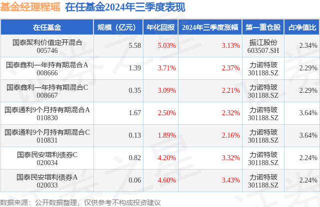 从基金规模来看,国泰民安增利债券C基金2024年三季度公布的基金规模为0.82亿元,较上一期规模8278.15万元变化了-124.75万元,环比变化了-1.51%。该基金最新一期资产配置为:股票占净值比15.46%,债券占净值比85.06%,现金占净值比0.47%。从基金持仓来看,该基金当季前十大股票仓位达10.04%,第一大重仓股为力诺特玻(301188),持仓占比为2.24%。