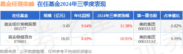 从基金规模来看,嘉实稳健混合基金2024年三季度公布的基金规模为18.01亿元,较上一期规模16.46亿元变化了1.55亿元,环比变化了9.44%。该基金最新一期资产配置为:股票占净值比73.94%,债券占净值比20.59%,现金占净值比8.05%。从基金持仓来看,该基金当季前十大股票仓位达40.72%,第一大重仓股为美的集团(000333),持仓占比为6.99%。