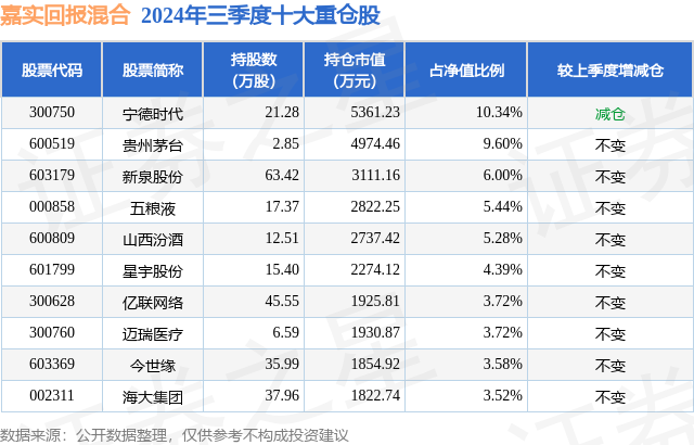 从基金规模来看,嘉实回报混合基金2024年三季度公布的基金规模为5.18亿元,较上一期规模4.61亿元变化了5787.04万元,环比变化了12.57%。该基金最新一期资产配置为:股票占净值比77.47%,债券占净值比5.22%,现金占净值比17.67%。从基金持仓来看,该基金当季前十大股票仓位达55.59%,第一大重仓股为宁德时代(300750),持仓占比为10.34%。