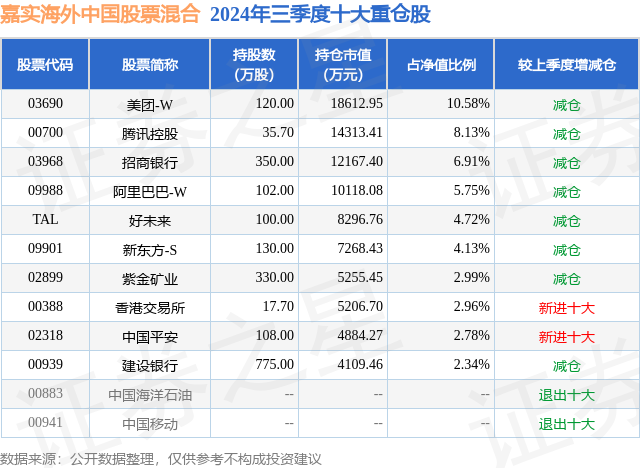 从基金规模来看,嘉实海外中国股票混合基金2024年三季度公布的基金规模为17.6亿元,较上一期规模15.71亿元变化了1.88亿元,环比变化了11.98%。该基金最新一期资产配置为:股票占净值比79.06%,无债券类资产,现金占净值比21.59%。从基金持仓来看,该基金当季前十大股票仓位达51.29%,第一大重仓股为美团-W(03690),持仓占比为10.58%。