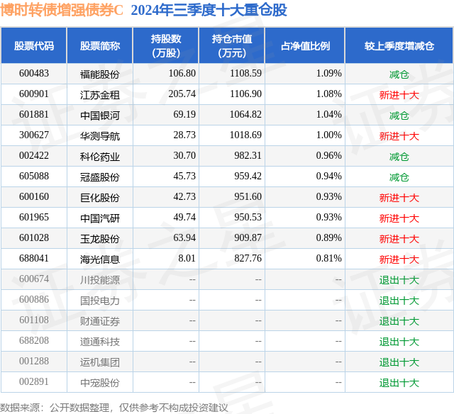 从基金规模来看,博时转债增强债券C基金2024年三季度公布的基金规模为2.38亿元,较上一期规模2.47亿元变化了-879.39万元,环比变化了-3.56%。该基金最新一期资产配置为:股票占净值比14.17%,债券占净值比91.81%,现金占净值比2.55%。从基金持仓来看,该基金当季前十大股票仓位达9.67%,第一大重仓股为福能股份(600483),持仓占比为1.09%。
