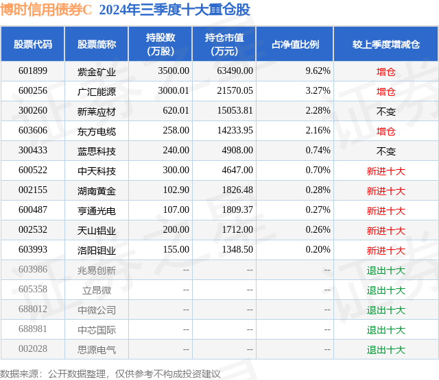 从基金规模来看,博时信用债券C基金2024年三季度公布的基金规模为6.75亿元,较上一期规模11.3亿元变化了-4.55亿元,环比变化了-40.25%。该基金最新一期资产配置为:股票占净值比19.82%,债券占净值比90.8%,现金占净值比4.94%。从基金持仓来看,该基金当季前十大股票仓位达19.78%,第一大重仓股为紫金矿业(601899),持仓占比为9.62%。
