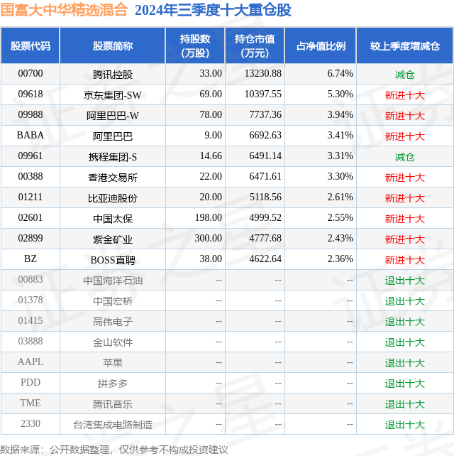 从基金规模来看,国富大中华精选混合基金2024年三季度公布的基金规模为19.63亿元,较上一期规模18.11亿元变化了1.52亿元,环比变化了8.4%。该基金最新一期资产配置为:股票占净值比66.21%,债券占净值比5.0%,现金占净值比9.3%。从基金持仓来看,该基金当季前十大股票仓位达35.95%,第一大重仓股为腾讯控股(00700),持仓占比为6.74%。