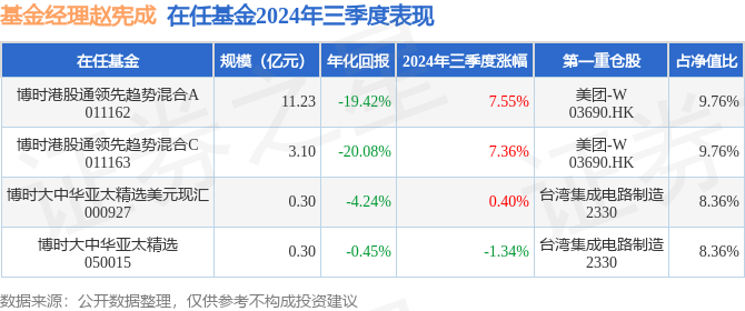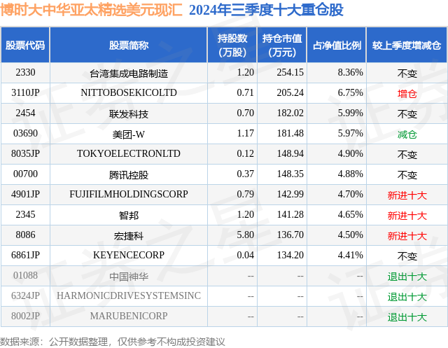 从基金规模来看,博时大中华亚太精选美元现汇基金2024年三季度公布的基金规模为0.3亿元,较上一期规模2679.18万元变化了360.53万元,环比变化了13.46%。该基金最新一期资产配置为:股票占净值比90.72%,无债券类资产,现金占净值比10.46%。从基金持仓来看,该基金当季前十大股票仓位达55.11%,第一大重仓股为台湾集成电路制造(2330),持仓占比为8.36%。