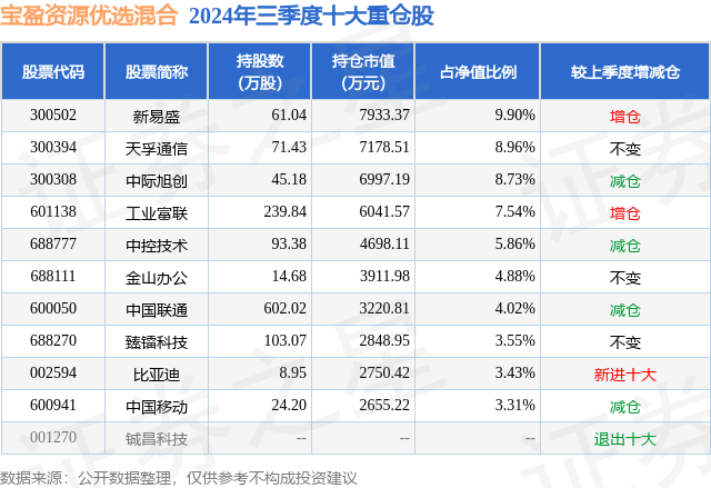 从基金规模来看,宝盈资源优选混合基金2024年三季度公布的基金规模为8.01亿元,较上一期规模7.48亿元变化了5318.19万元,环比变化了7.11%。该基金最新一期资产配置为:股票占净值比92.04%,无债券类资产,现金占净值比6.13%。从基金持仓来看,该基金当季前十大股票仓位达60.18%,第一大重仓股为新易盛(300502),持仓占比为9.9%。