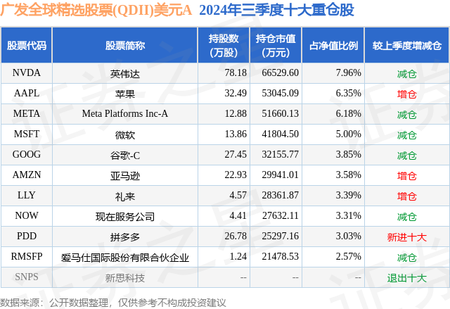 从基金规模来看,广发全球精选股票(QDII)美元A基金2024年三季度公布的基金规模为80.67亿元,较上一期规模80.28亿元变化了3918.37万元,环比变化了0.49%。该基金最新一期资产配置为:股票占净值比75.42%,无债券类资产,现金占净值比21.33%。从基金持仓来看,该基金当季前十大股票仓位达45.22%,第一大重仓股为英伟达(NVDA),持仓占比为7.96%。