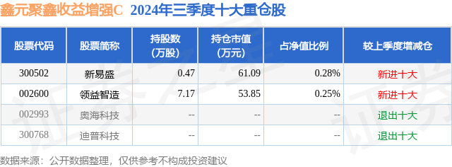 从基金规模来看,鑫元聚鑫收益增强C基金2024年三季度公布的基金规模为0.24亿元,较上一期规模1404.09万元变化了1026.48万元,环比变化了73.11%。该基金最新一期资产配置为:股票占净值比0.53%,债券占净值比56.9%,现金占净值比14.98%。从基金持仓来看,该基金当季前十大股票仓位达0.53%,第一大重仓股为新易盛(300502),持仓占比为0.28%。