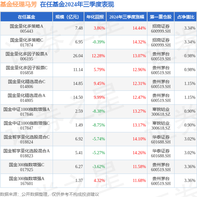 从基金规模来看,国金300指数增强A基金2024年三季度公布的基金规模为1.37亿元,较上一期规模1.87亿元变化了-4974.93万元,环比变化了-26.57%。该基金最新一期资产配置为:股票占净值比94.12%,无债券类资产,现金占净值比7.15%。从基金持仓来看,该基金当季前十大股票仓位达23.34%,第一大重仓股为贵州茅台(600519),持仓占比为3.36%。