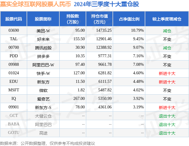 从基金规模来看,嘉实全球互联网股票人民币基金2024年三季度公布的基金规模为9.29亿元,较上一期规模8.95亿元变化了3383.43万元,环比变化了3.78%。该基金最新一期资产配置为:股票占净值比49.8%,无债券类资产,现金占净值比8.1%。从基金持仓来看,该基金当季前十大股票仓位达63.76%,第一大重仓股为美团-W(03690),持仓占比为10.79%。