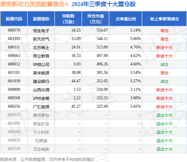 从基金规模来看,诺安新动力灵活配置混合A基金2024年三季度公布的基金规模为0.97亿元,较上一期规模9533.59万元变化了214.88万元,环比变化了2.25%。该基金最新一期资产配置为:股票占净值比78.44%,债券占净值比2.31%,现金占净值比9.28%。从基金持仓来看,该基金当季前十大股票仓位达40.2%,第一大重仓股为恒生电子(600570),持仓占比为5.14%。