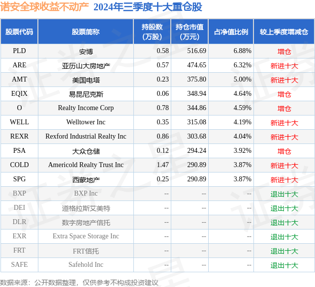 从基金规模来看,诺安全球收益不动产基金2024年三季度公布的基金规模为0.75亿元,较上一期规模2431.34万元变化了5083.73万元,环比变化了209.09%。该基金最新一期资产配置为:无股票类资产,无债券类资产,现金占净值比21.26%。从基金持仓来看,该基金当季前十大股票仓位达47.32%,第一大重仓股为安博(PLD),持仓占比为6.88%。