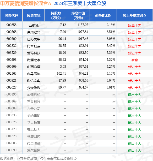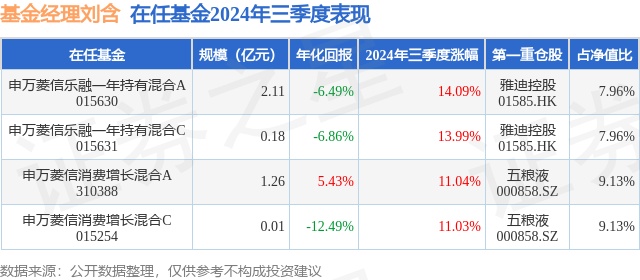 从基金规模来看,申万菱信消费增长混合A基金2024年三季度公布的基金规模为1.26亿元,较上一期规模1.16亿元变化了964.41万元,环比变化了8.28%。该基金最新一期资产配置为:股票占净值比92.94%,无债券类资产,现金占净值比6.52%。从基金持仓来看,该基金当季前十大股票仓位达62.27%,第一大重仓股为五粮液(000858),持仓占比为9.13%。