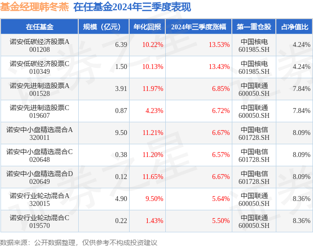 诺安中小盘精选混合A现任基金经理为韩冬燕。其中在任基金经理韩冬燕已从业8年又359天,2016年9月13日正式接手管理诺安中小盘精选混合A,任职期间累计回报为79.89%。目前还管理着9只基金产品(包括A类和C类),其中本季度表现最佳的基金为诺安低碳经济股票A(001208),季度净值涨幅为13.53%。