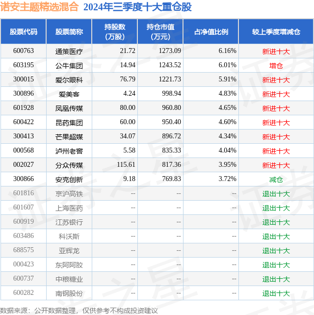 从基金规模来看,诺安主题精选混合基金2024年三季度公布的基金规模为2.07亿元,较上一期规模2.12亿元变化了-498.39万元,环比变化了-2.35%。该基金最新一期资产配置为:股票占净值比76.06%,无债券类资产,现金占净值比23.25%。从基金持仓来看,该基金当季前十大股票仓位达48.21%,第一大重仓股为通策医疗(600763),持仓占比为6.16%。