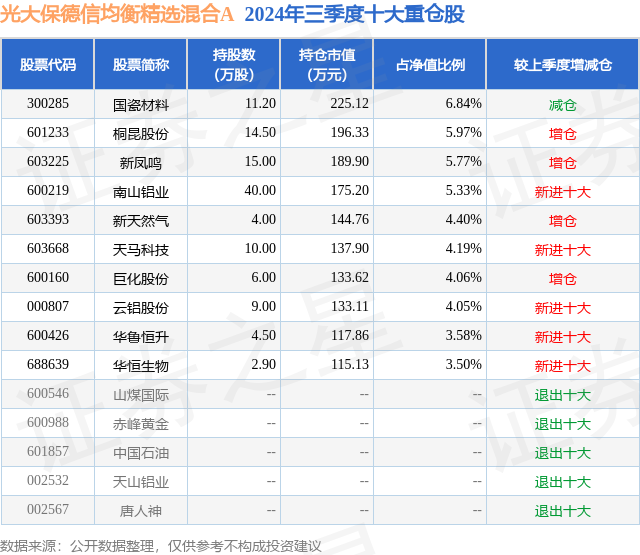 从基金规模来看,光大保德信均衡精选混合A基金2024年三季度公布的基金规模为0.33亿元,较上一期规模3280.12万元变化了4.87万元,环比变化了0.15%。该基金最新一期资产配置为:股票占净值比89.16%,债券占净值比2.42%,现金占净值比9.19%。从基金持仓来看,该基金当季前十大股票仓位达47.69%,第一大重仓股为国瓷材料(300285),持仓占比为6.84%。