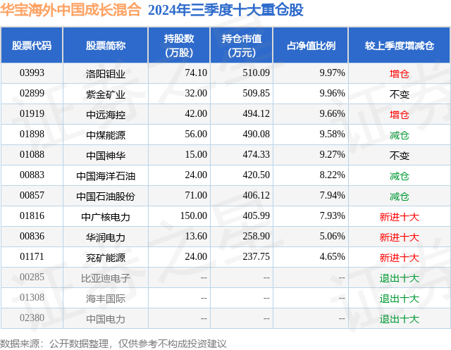 从基金规模来看,华宝海外中国成长混合基金2024年三季度公布的基金规模为0.51亿元,较上一期规模5413.24万元变化了-295.91万元,环比变化了-5.47%。该基金最新一期资产配置为:股票占净值比94.26%,无债券类资产,现金占净值比5.61%。从基金持仓来看,该基金当季前十大股票仓位达82.24%,第一大重仓股为洛阳钼业(03993),持仓占比为9.97%。