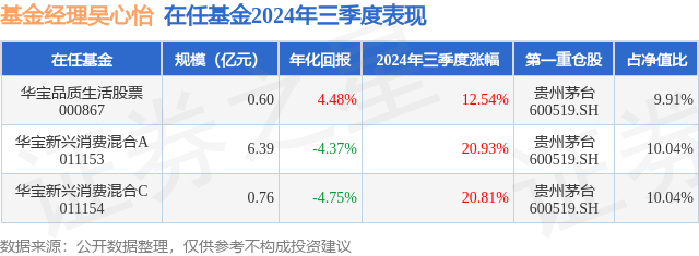 从基金规模来看,华宝品质生活股票基金2024年三季度公布的基金规模为0.6亿元,较上一期规模5390.22万元变化了606.33万元,环比变化了11.25%。该基金最新一期资产配置为:股票占净值比92.31%,无债券类资产,现金占净值比8.31%。从基金持仓来看,该基金当季前十大股票仓位达72.36%,第一大重仓股为贵州茅台(600519),持仓占比为9.91%。