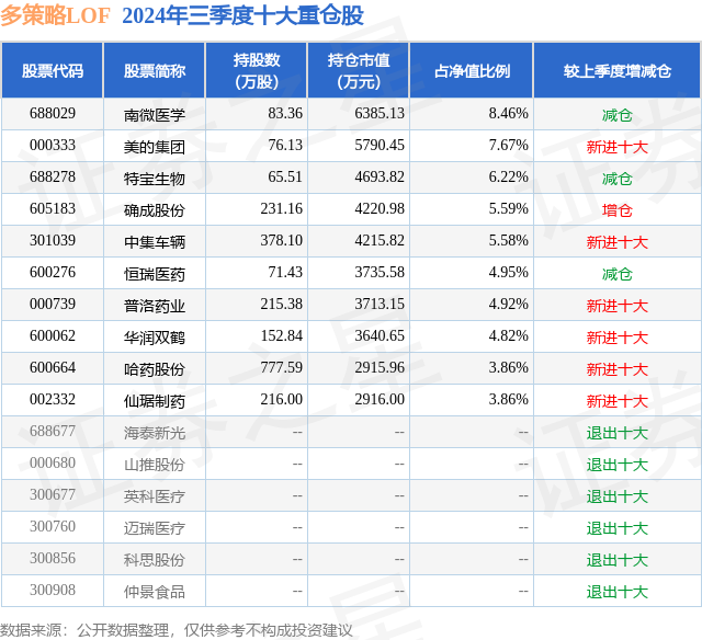 从基金规模来看,多策略LOF基金2024年三季度公布的基金规模为4.91亿元,较上一期规模6.92亿元变化了-2.01亿元,环比变化了-29.05%。该基金最新一期资产配置为:股票占净值比85.31%,无债券类资产,现金占净值比11.4%。从基金持仓来看,该基金当季前十大股票仓位达55.93%,第一大重仓股为南微医学(688029),持仓占比为8.46%。