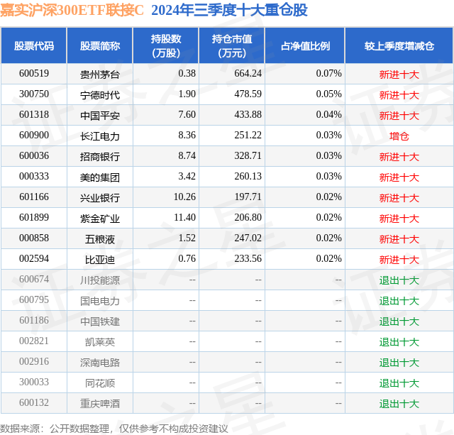 从基金规模来看,嘉实沪深300ETF联接C基金2024年三季度公布的基金规模为14.4亿元,较上一期规模10.06亿元变化了4.34亿元,环比变化了43.1%。该基金最新一期资产配置为:股票占净值比1.38%,债券占净值比1.01%,现金占净值比5.9%。从基金持仓来看,该基金当季前十大股票仓位达0.33%,第一大重仓股为贵州茅台(600519),持仓占比为0.07%。