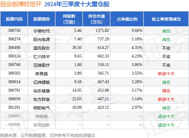 从基金规模来看,创业板博时定开基金2024年三季度公布的基金规模为1.42亿元,较上一期规模1.61亿元变化了-1814.32万元,环比变化了-11.3%。该基金最新一期资产配置为:股票占净值比84.36%,无债券类资产,现金占净值比18.42%。从基金持仓来看,该基金当季前十大股票仓位达43.35%,第一大重仓股为宁德时代(300750),持仓占比为9.66%。
