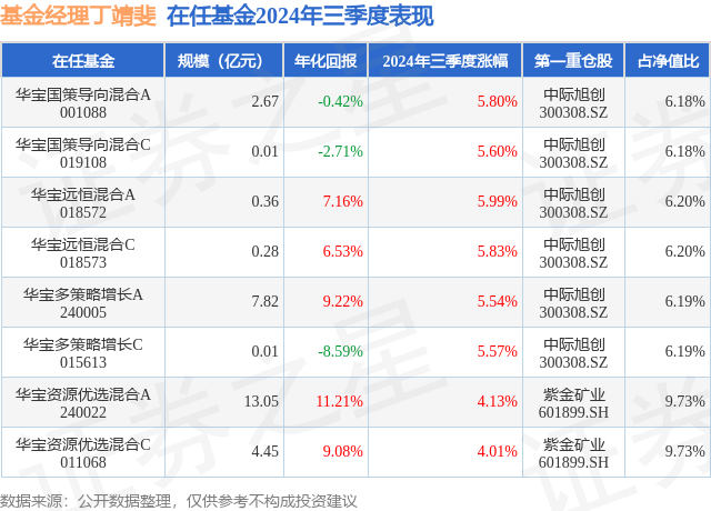 从基金规模来看,华宝国策导向混合A基金2024年三季度公布的基金规模为2.67亿元,较上一期规模2.63亿元变化了376.21万元,环比变化了1.43%。该基金最新一期资产配置为:股票占净值比89.03%,无债券类资产,现金占净值比13.71%。从基金持仓来看,该基金当季前十大股票仓位达41.05%,第一大重仓股为中际旭创(300308),持仓占比为6.18%。