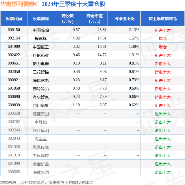 从基金规模来看,华富恒利债券C基金2024年三季度公布的基金规模为0.02亿元,较上一期规模99.34万元变化了60.11万元,环比变化了60.51%。该基金最新一期资产配置为:股票占净值比18.12%,债券占净值比91.17%,现金占净值比2.98%。从基金持仓来看,该基金当季前十大股票仓位达10.81%,第一大重仓股为中国船舶(600150),持仓占比为2.13%。