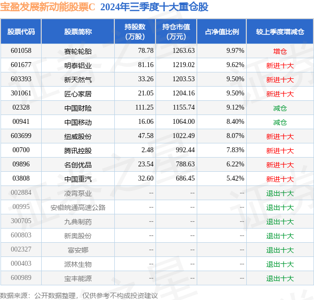 从基金规模来看,宝盈发展新动能股票C基金2024年三季度公布的基金规模为0.19亿元,较上一期规模1946.82万元变化了-53.76万元,环比变化了-2.76%。该基金最新一期资产配置为:股票占净值比93.46%,债券占净值比0.92%,现金占净值比7.23%。从基金持仓来看,该基金当季前十大股票仓位达83.65%,第一大重仓股为赛轮轮胎(601058),持仓占比为9.97%。