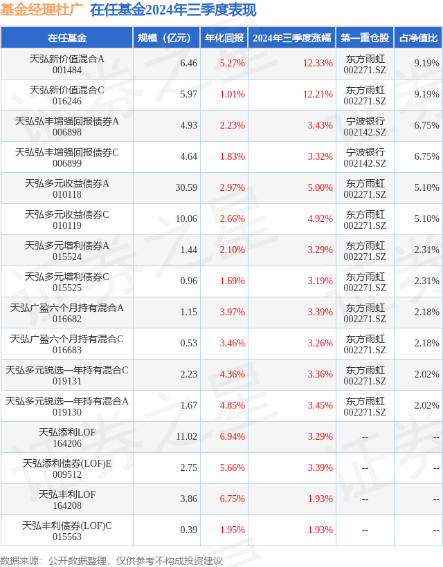 证券之星消息,日前天弘多元收益债券C基金公布三季报,2024年三季度最新规模10.06亿元,季度净值涨幅为4.92%。