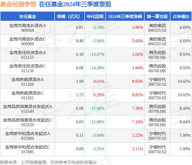 金鹰内需成长混合C现任基金经理为李恒。其中在任基金经理李恒已从业2年又228天,2024年4月30日正式接手管理金鹰内需成长混合C,任职期间累计回报为-1.63%。目前还管理着10只基金产品(包括A类和C类),其中本季度表现最佳的基金为金鹰新能源混合A(011260),季度净值涨幅为8.93%。