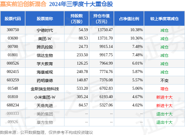 从基金规模来看,嘉实前沿创新混合基金2024年三季度公布的基金规模为13.25亿元,较上一期规模10.73亿元变化了2.52亿元,环比变化了23.49%。该基金最新一期资产配置为:股票占净值比95.09%,债券占净值比4.67%,现金占净值比0.61%。从基金持仓来看,该基金当季前十大股票仓位达66.9%,第一大重仓股为宁德时代(300750),持仓占比为10.38%。