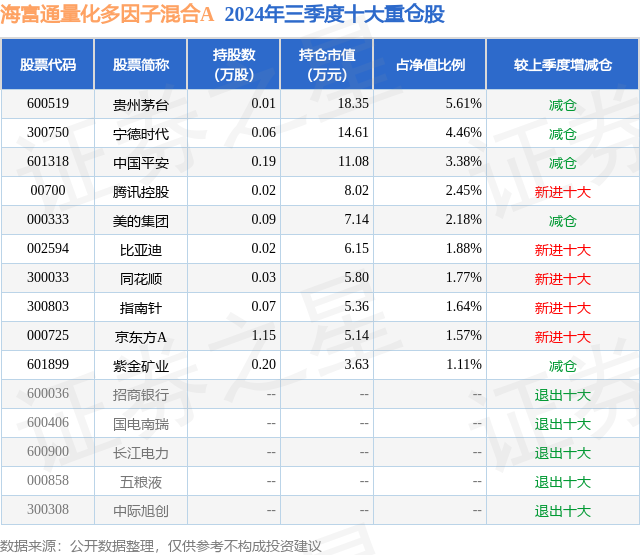 从基金规模来看,海富通量化多因子混合A基金2024年三季度公布的基金规模为0.03亿元,较上一期规模4650.28万元变化了-4391.04万元,环比变化了-94.43%。该基金最新一期资产配置为:股票占净值比84.51%,债券占净值比6.24%,现金占净值比5.37%。从基金持仓来看,该基金当季前十大股票仓位达26.05%,第一大重仓股为贵州茅台(600519),持仓占比为5.61%。