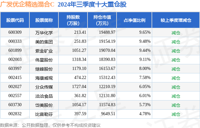 从基金规模来看,广发优企精选混合C基金2024年三季度公布的基金规模为2.35亿元,较上一期规模3.66亿元变化了-1.32亿元,环比变化了-35.96%。该基金最新一期资产配置为:股票占净值比94.84%,债券占净值比0.69%,现金占净值比4.95%。从基金持仓来看,该基金当季前十大股票仓位达75.83%,第一大重仓股为万华化学(600309),持仓占比为9.65%。