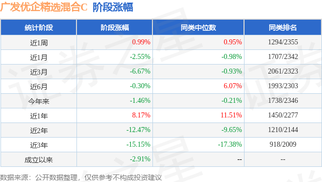 从业绩表现来看,广发优企精选混合C基金过去一年净值涨幅为1.6%,在同类基金中排名1517/2261,同类基金过去一年净值涨幅中位数为5.1%。而基金过去一年的最大回撤为-17.23%,成立以来的最大回撤为-29.93%。