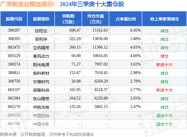 从基金规模来看,广发制造业精选混合C基金2024年三季度公布的基金规模为1.14亿元,较上一期规模2.16亿元变化了-1.02亿元,环比变化了-47.2%。该基金最新一期资产配置为:股票占净值比91.07%,无债券类资产,现金占净值比9.07%。从基金持仓来看,该基金当季前十大股票仓位达38.42%,第一大重仓股为欣旺达(300207),持仓占比为6.45%。