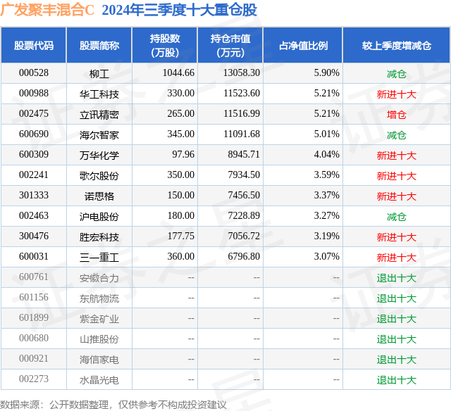 从基金规模来看,广发聚丰混合C基金2024年三季度公布的基金规模为0.1亿元,较上一期规模967.85万元变化了-6.73万元,环比变化了-0.7%。该基金最新一期资产配置为:股票占净值比87.73%,无债券类资产,现金占净值比15.47%。从基金持仓来看,该基金当季前十大股票仓位达41.86%,第一大重仓股为柳工(000528),持仓占比为5.9%。