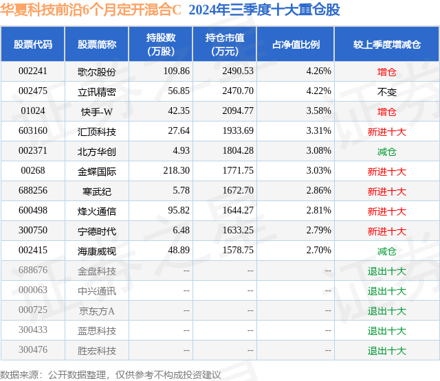 从基金规模来看,华夏科技前沿6个月定开混合C基金2024年三季度公布的基金规模为1.63亿元,较上一期规模1.47亿元变化了1659.71万元,环比变化了11.32%。该基金最新一期资产配置为:股票占净值比87.48%,债券占净值比0.18%,现金占净值比12.49%。从基金持仓来看,该基金当季前十大股票仓位达32.64%,第一大重仓股为歌尔股份(002241),持仓占比为4.26%。