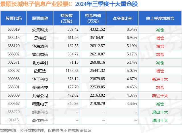 从基金规模来看,景顺长城电子信息产业股票C基金2024年三季度公布的基金规模为16.97亿元,较上一期规模21.63亿元变化了-4.66亿元,环比变化了-21.56%。该基金最新一期资产配置为:股票占净值比92.27%,债券占净值比3.37%,现金占净值比3.86%。从基金持仓来看,该基金当季前十大股票仓位达53.82%,第一大重仓股为安集科技(688019),持仓占比为8.54%。