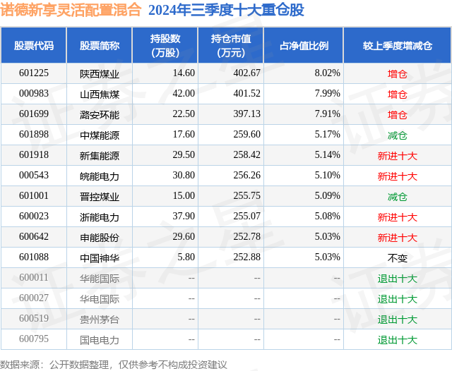 从基金规模来看,诺德新享灵活配置混合基金2024年三季度公布的基金规模为0.5亿元,较上一期规模5138.03万元变化了-114.45万元,环比变化了-2.23%。该基金最新一期资产配置为:股票占净值比92.76%,无债券类资产,现金占净值比7.32%。从基金持仓来看,该基金当季前十大股票仓位达59.56%,第一大重仓股为陕西煤业(601225),持仓占比为8.02%。