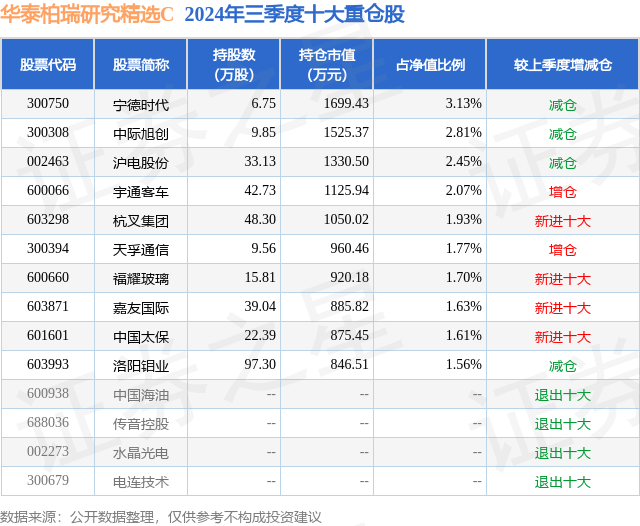 从基金规模来看,华泰柏瑞研究精选C基金2024年三季度公布的基金规模为0.58亿元,较上一期规模4196.17万元变化了1625.31万元,环比变化了38.73%。该基金最新一期资产配置为:股票占净值比88.36%,无债券类资产,现金占净值比11.87%。从基金持仓来看,该基金当季前十大股票仓位达20.66%,第一大重仓股为宁德时代(300750),持仓占比为3.13%。