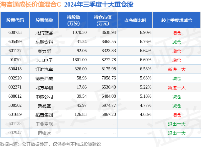 从基金规模来看,海富通成长价值混合C基金2024年三季度公布的基金规模为1.17亿元,较上一期规模1.05亿元变化了1189.74万元,环比变化了11.37%。该基金最新一期资产配置为:股票占净值比93.99%,无债券类资产,现金占净值比8.09%。从基金持仓来看,该基金当季前十大股票仓位达58.91%,第一大重仓股为北汽蓝谷(600733),持仓占比为6.9%。