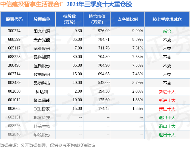 从基金规模来看,中信建投智享生活混合C基金2024年三季度公布的基金规模为0.4亿元,较上一期规模3512.08万元变化了510.16万元,环比变化了14.53%。该基金最新一期资产配置为:股票占净值比92.69%,债券占净值比2.15%,现金占净值比5.51%。从基金持仓来看,该基金当季前十大股票仓位达60.0%,第一大重仓股为阳光电源(300274),持仓占比为9.9%。