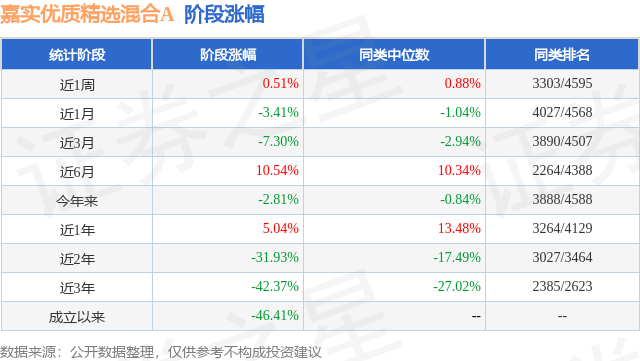 从业绩表现来看,嘉实优质精选混合A基金过去一年净值涨幅为6.06%,在同类基金中排名2127/3979,同类基金过去一年净值涨幅中位数为5.4%。而基金过去一年的最大回撤为-26.6%,成立以来的最大回撤为-64.95%。