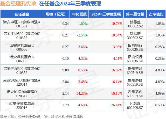 证券之星消息,日前诺安沪深300指数增强C基金公布三季报,2024年三季度最新规模9.0亿元,季度净值涨幅为16.02%。