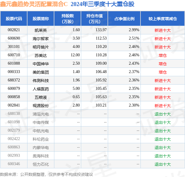 从基金规模来看,鑫元鑫趋势灵活配置混合C基金2024年三季度公布的基金规模为0.31亿元,较上一期规模3095.17万元变化了-36.24万元,环比变化了-1.17%。该基金最新一期资产配置为:股票占净值比89.19%,债券占净值比5.61%,现金占净值比4.78%。从基金持仓来看,该基金当季前十大股票仓位达24.58%,第一大重仓股为凯莱英(002821),持仓占比为2.99%。