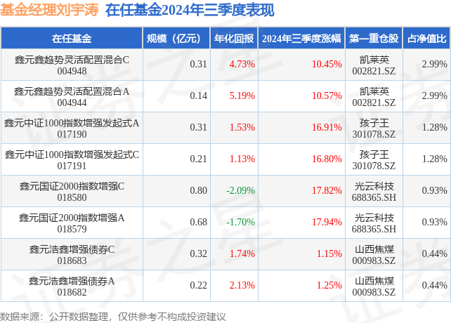 鑫元鑫趋势灵活配置混合C现任基金经理为刘宇涛。其中在任基金经理刘宇涛已从业2年又38天,2022年9月20日正式接手管理鑫元鑫趋势灵活配置混合C,任职期间累计回报为-2.11%。目前还管理着8只基金产品(包括A类和C类),其中本季度表现最佳的基金为鑫元国证2000指数增强A(018579),季度净值涨幅为17.94%。