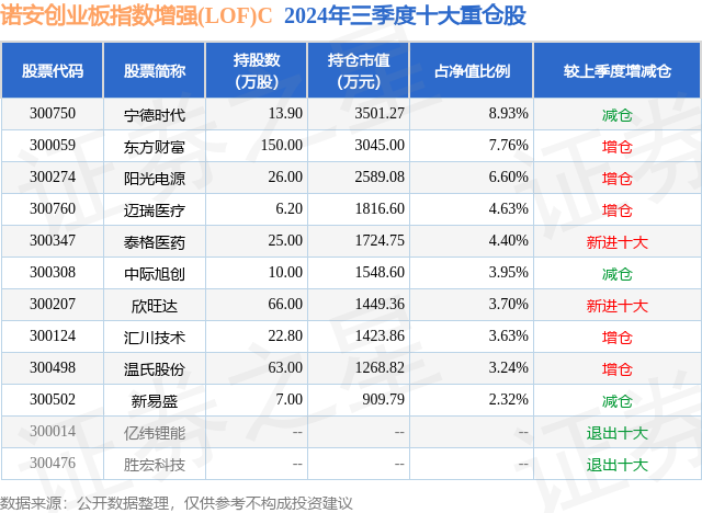 从基金规模来看,诺安创业板指数增强(LOF)C基金2024年三季度公布的基金规模为1.95亿元,较上一期规模1.34亿元变化了6040.47万元,环比变化了44.98%。该基金最新一期资产配置为:股票占净值比93.94%,无债券类资产,现金占净值比5.28%。从基金持仓来看,该基金当季前十大股票仓位达49.16%,第一大重仓股为宁德时代(300750),持仓占比为8.93%。