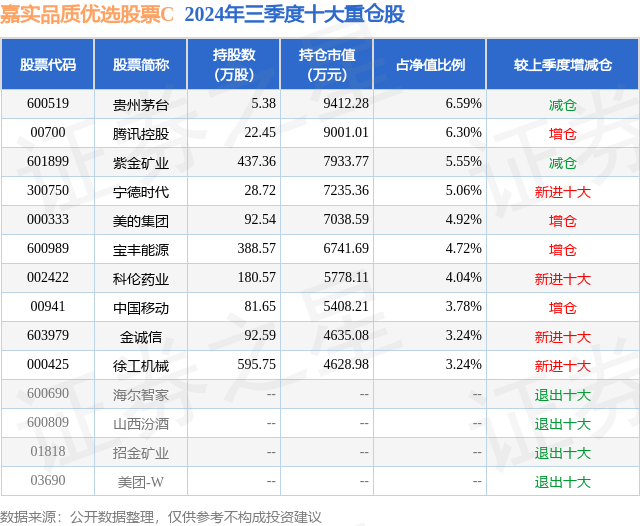从基金规模来看,嘉实品质优选股票C基金2024年三季度公布的基金规模为0.52亿元,较上一期规模6124.55万元变化了-933.66万元,环比变化了-15.24%。该基金最新一期资产配置为:股票占净值比91.33%,债券占净值比1.44%,现金占净值比5.11%。从基金持仓来看,该基金当季前十大股票仓位达47.44%,第一大重仓股为贵州茅台(600519),持仓占比为6.59%。