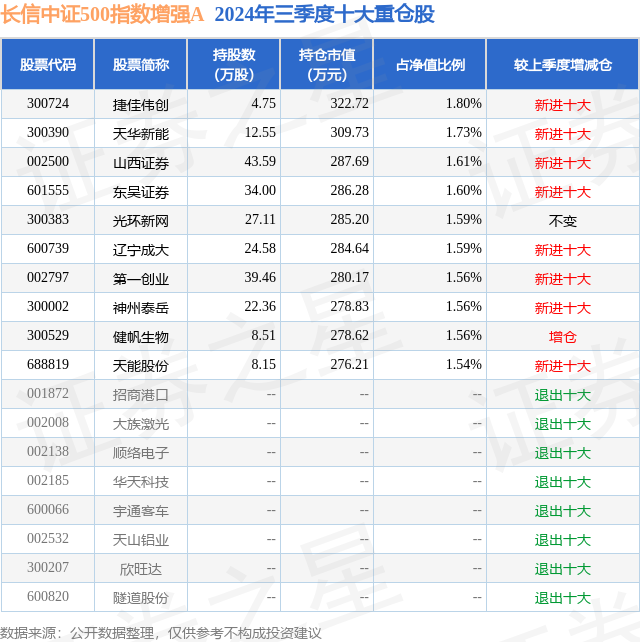 从基金规模来看,长信中证500指数增强A基金2024年三季度公布的基金规模为1.77亿元,较上一期规模1.57亿元变化了2030.89万元,环比变化了12.97%。该基金最新一期资产配置为:股票占净值比94.27%,无债券类资产,现金占净值比5.63%。从基金持仓来看,该基金当季前十大股票仓位达16.14%,第一大重仓股为捷佳伟创(300724),持仓占比为1.8%。