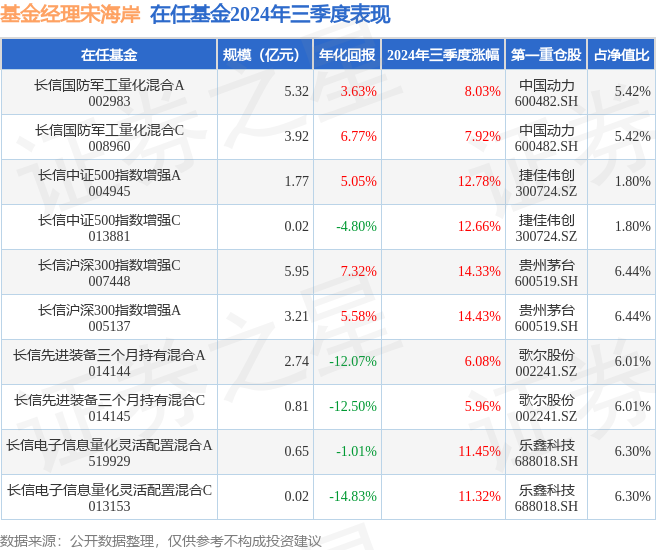 证券之星消息,日前长信中证500指数增强A基金公布三季报,2024年三季度最新规模1.77亿元,季度净值涨幅为12.78%。