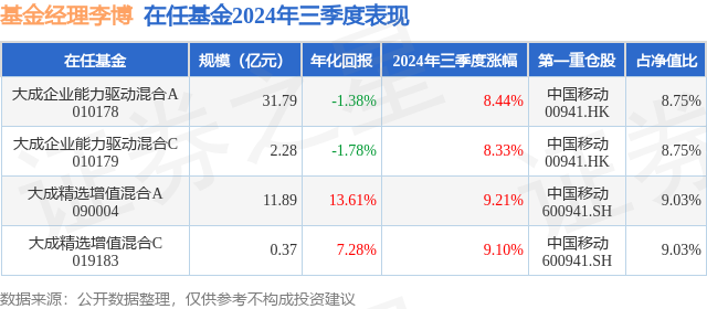 证券之星消息,日前大成企业能力驱动混合A基金公布三季报,2024年三季度最新规模31.79亿元,季度净值涨幅为8.44%。